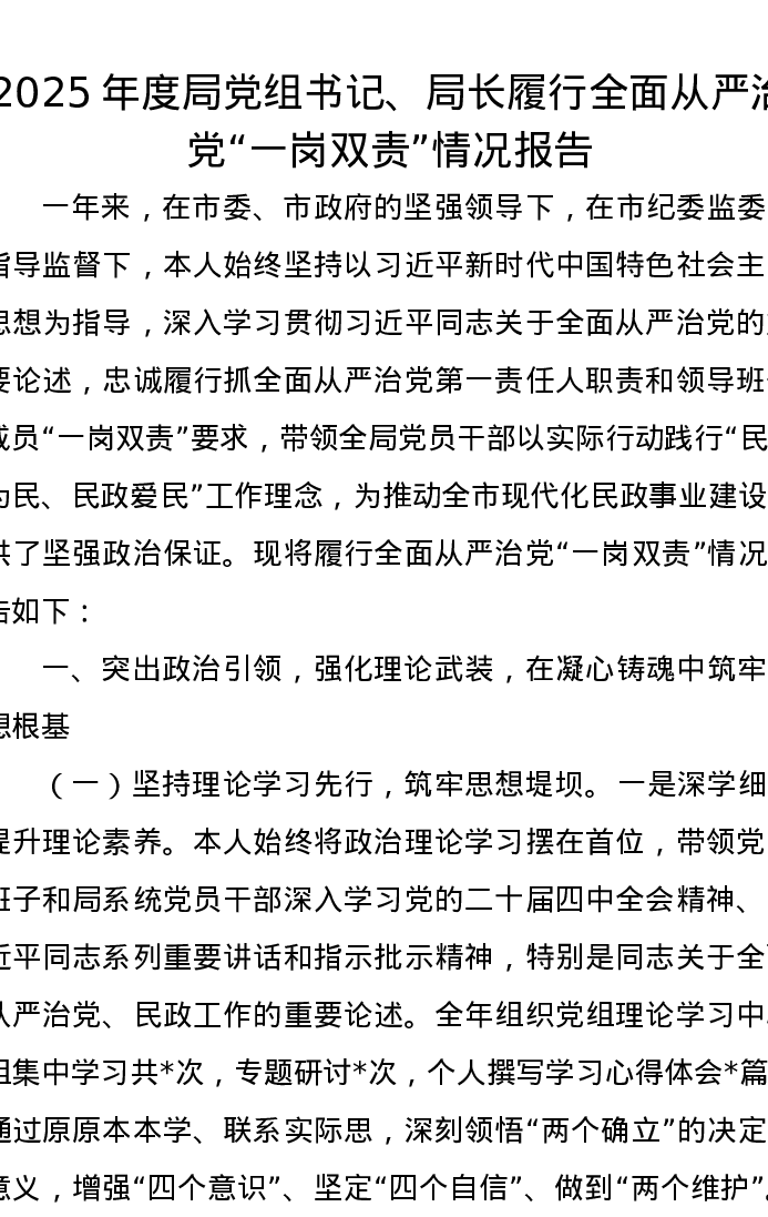 2025年度局党组书记、局长履行全面从严治党“一岗双责”情况报告