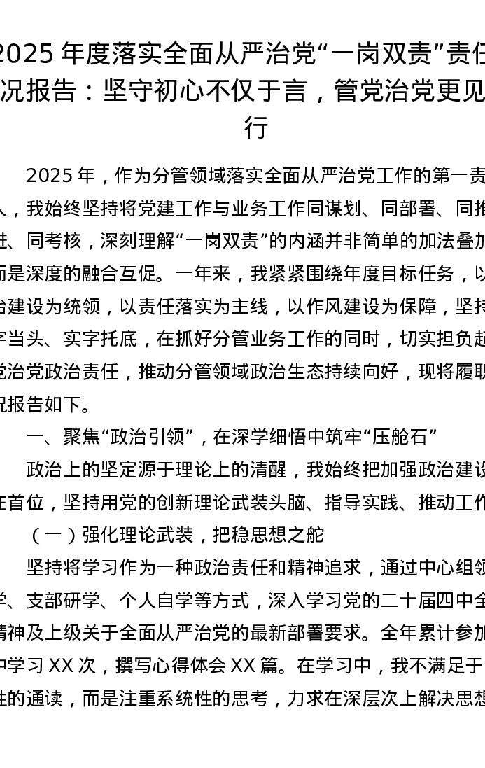 2025年度落实全面从严治党“一岗双责”责任情况报告:坚守初心不仅于言,管党治党更见于行
