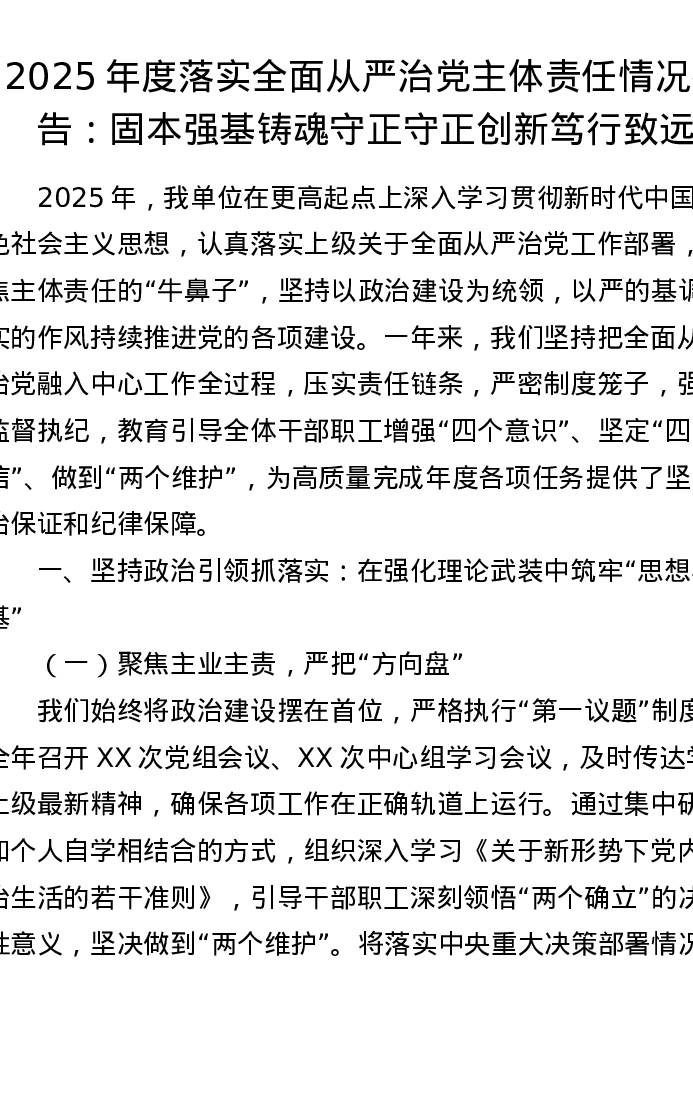2025年度落实全面从严治党主体责任情况报告:固本强基铸魂守正 守正创新笃行致远