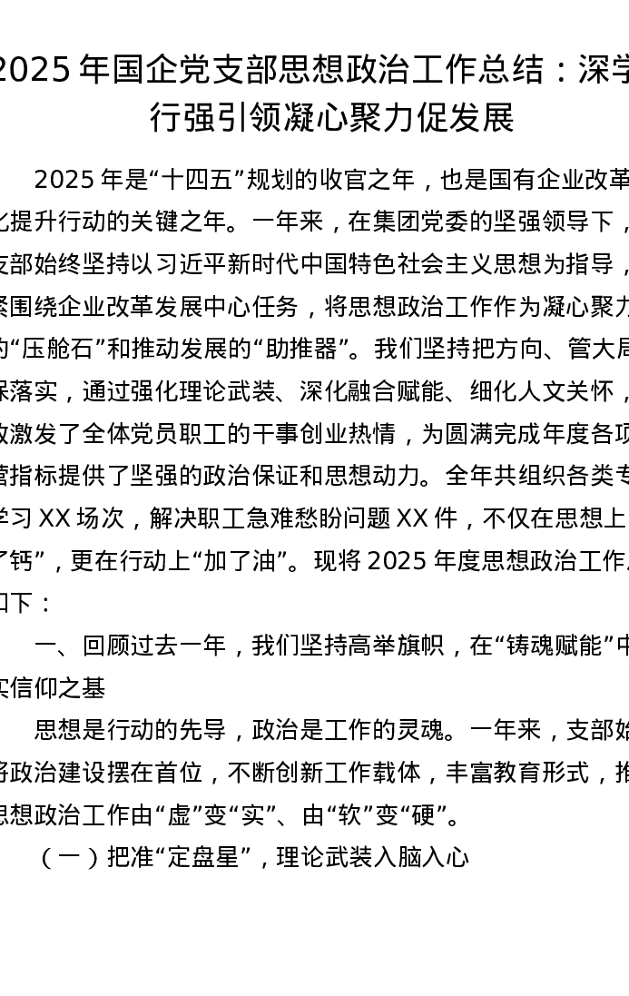 2025年国企党支部思想政治工作总结:深学笃行强引领 凝心聚力促发展