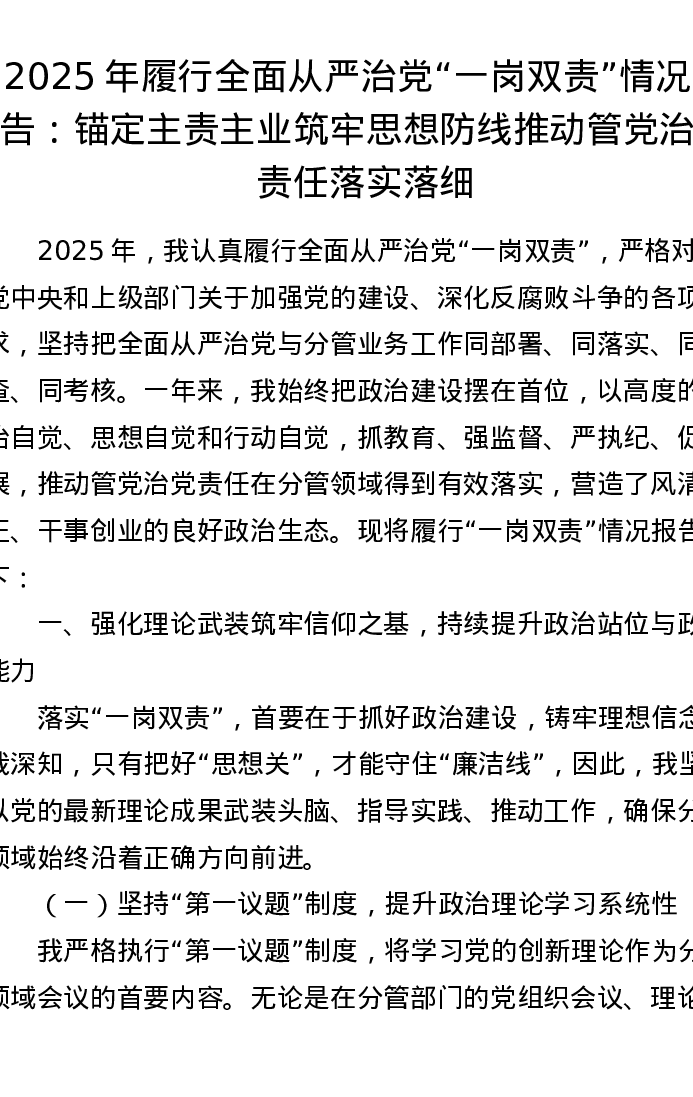 2025年履行全面从严治党“一岗双责”情况报告:锚定主责主业筑牢思想防线 推动管党治党责任落实落细