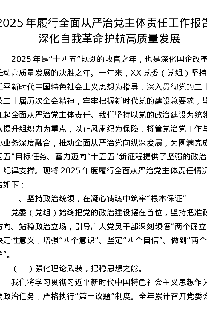 2025年履行全面从严治党主体责任工作报告:深化自我革命 护航高质量发展