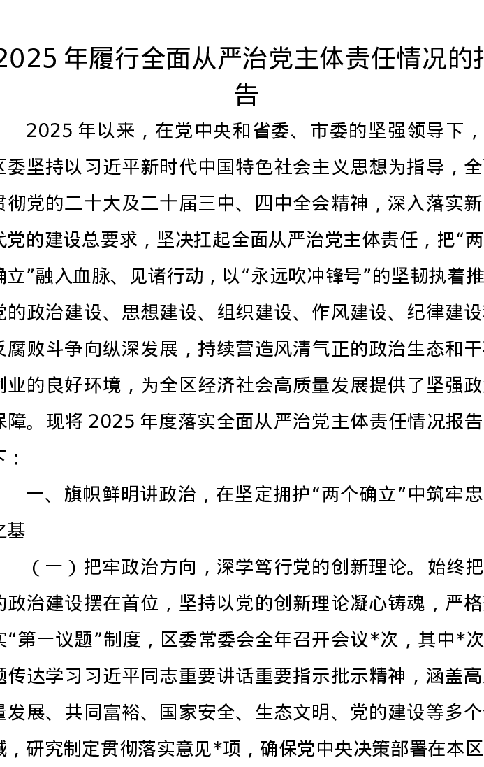 2025年履行全面从严治党主体责任情况的报告