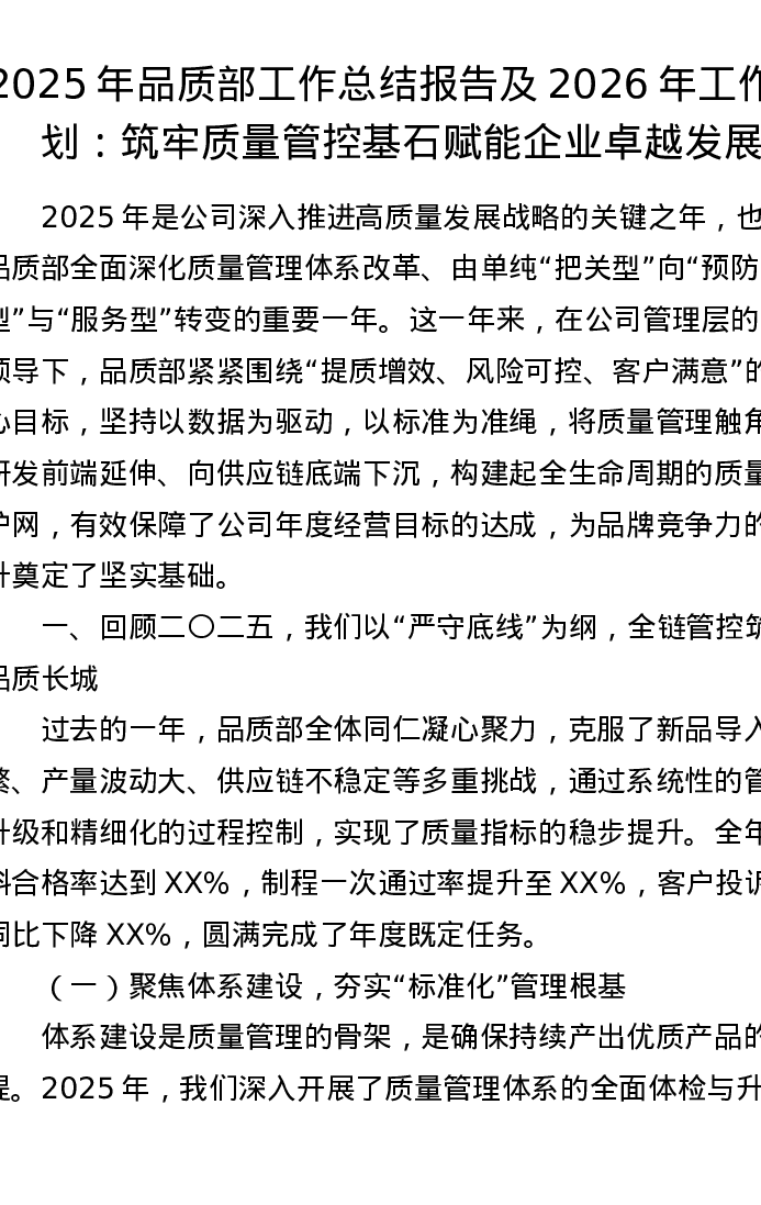 2025年品质部工作总结报告及2026年工作计划:筑牢质量管控基石 赋能企业卓越发展