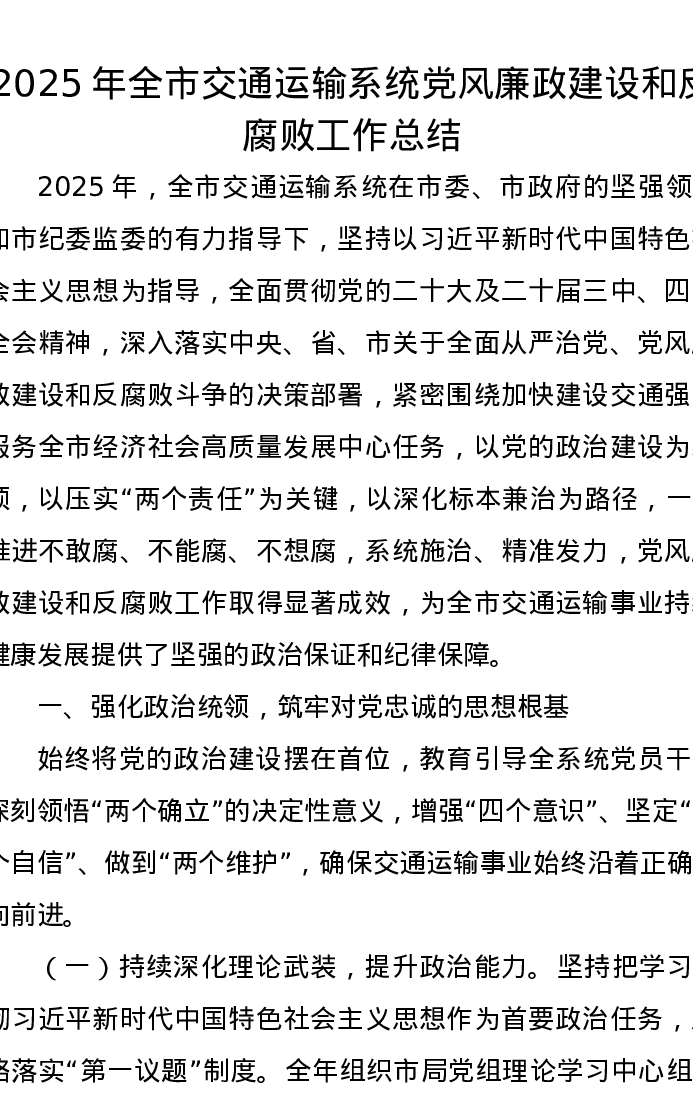 2025年全市交通运输系统党风廉政建设和反腐败工作总结