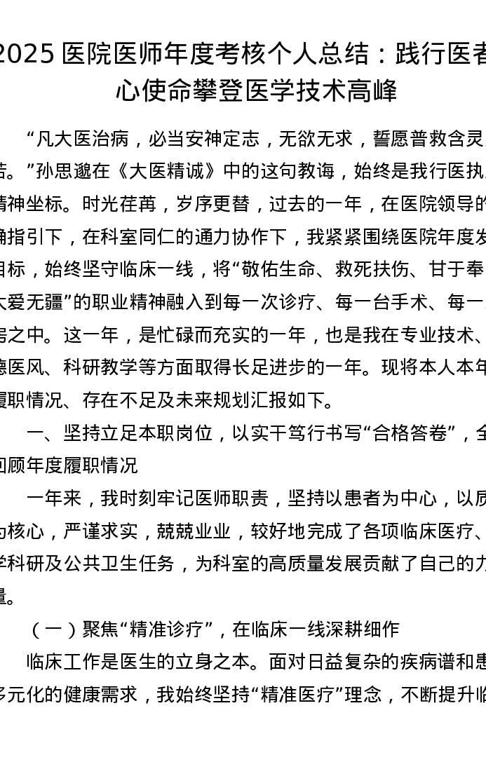 2025医院医师年度考核个人总结:践行医者仁心使命 攀登医学技术高峰