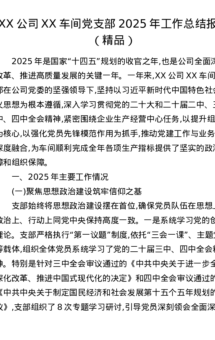 XX公司XX车间党支部2025年工作总结报告