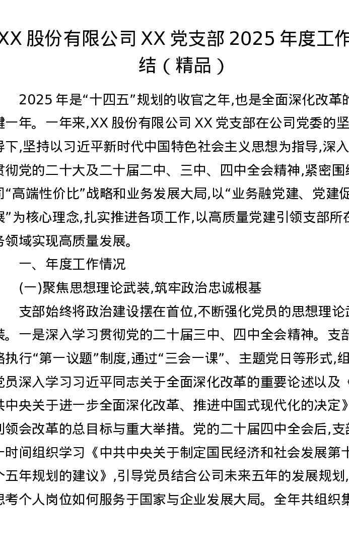 XX股份有限公司XX党支部2025年度工作总结