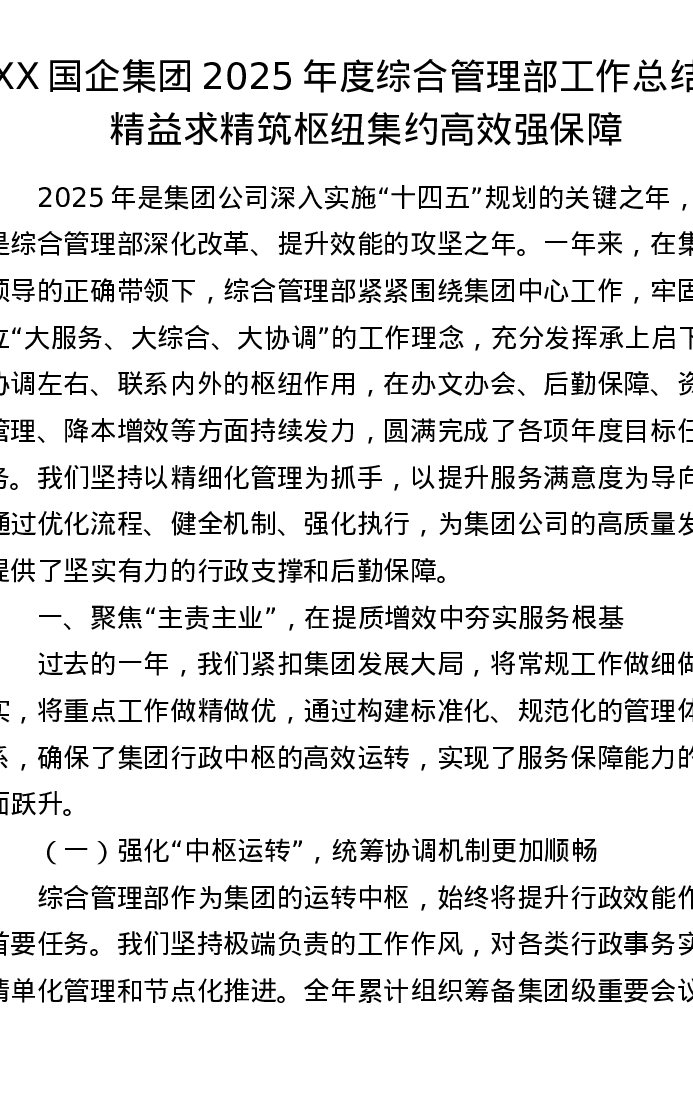 XX国企集团2025年度综合管理部工作总结:精益求精筑枢纽 集约高效强保障