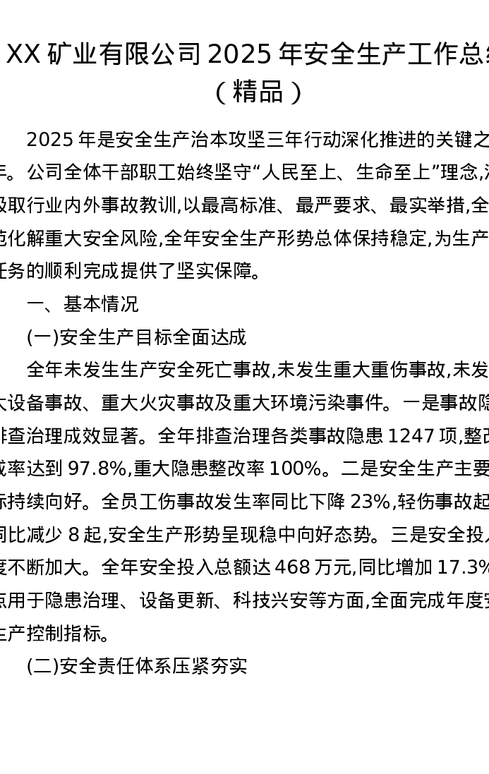 XX矿业有限公司2025年安全生产工作总结
