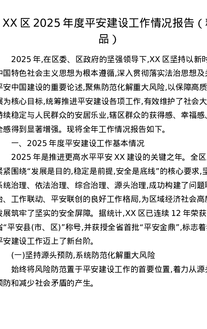 XX区2025年度平安建设工作情况报告