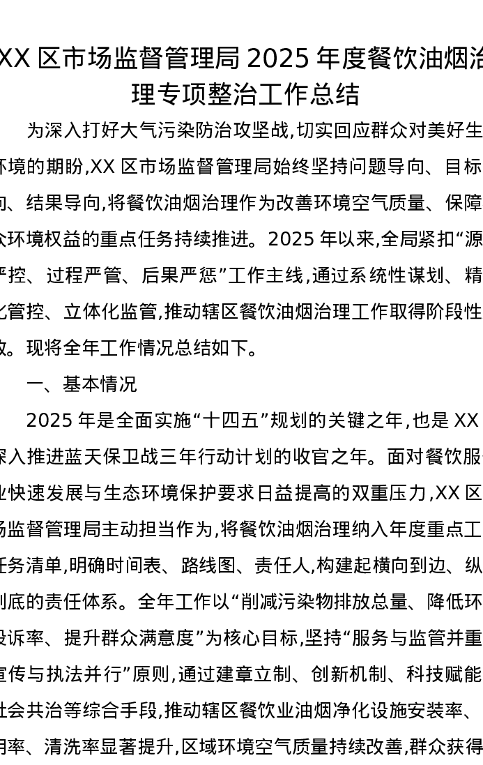 XX区市场监督管理局2025年度餐饮油烟治理专项整治工作总结