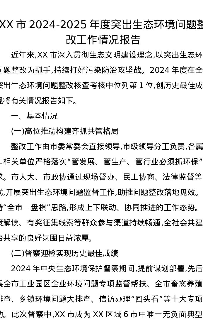 XX市2024-2025年度突出生态环境问题整改工作情况报告