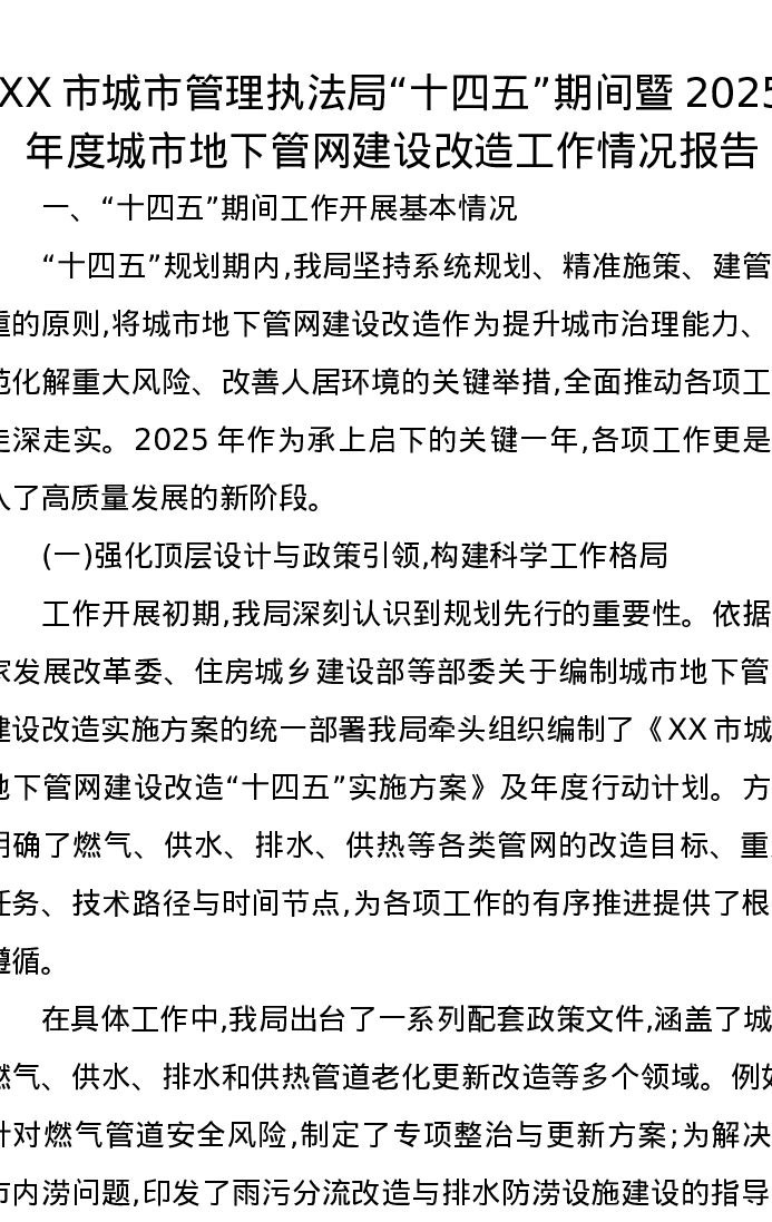 XX市城市管理执法局“十四五”期间暨2025年度城市地下管网建设改造工作情况报告