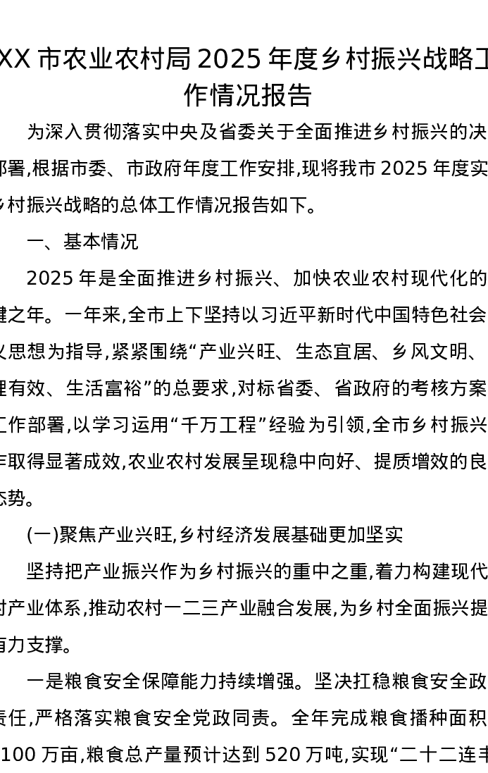 XX市农业农村局2025年度乡村振兴战略工作情况报告