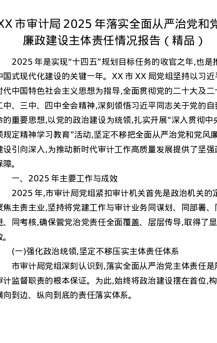 XX市审计局2025年落实全面从严治党和党风廉政建设主体责任情况报告