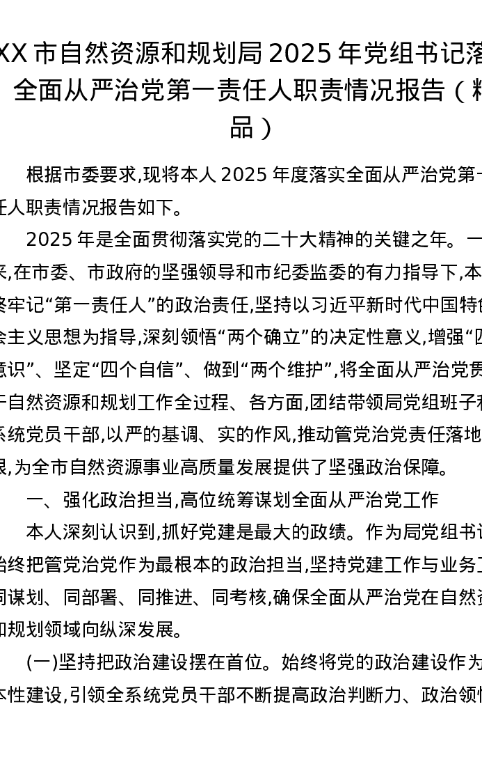 XX市自然资源和规划局2025年党组书记落实全面从严治党第一责任人职责情况报告