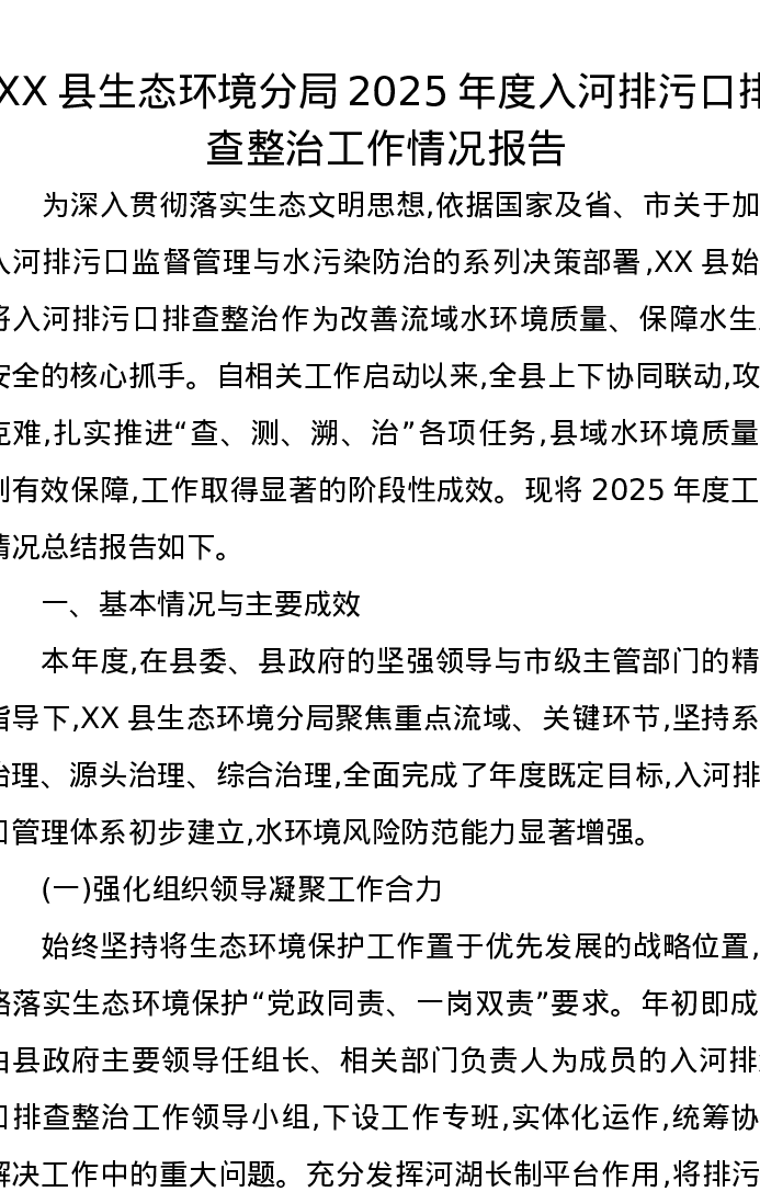 XX县生态环境分局2025年度入河排污口排查整治工作情况报告