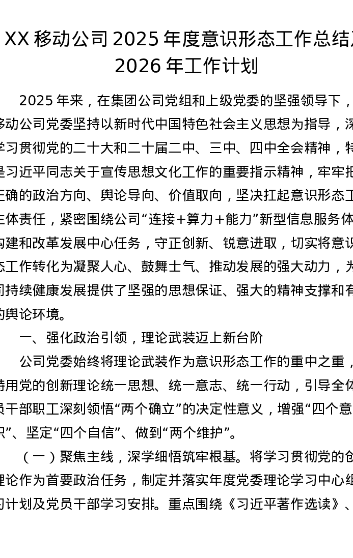 XX移动公司2025年度意识形态工作总结及2026年工作计划