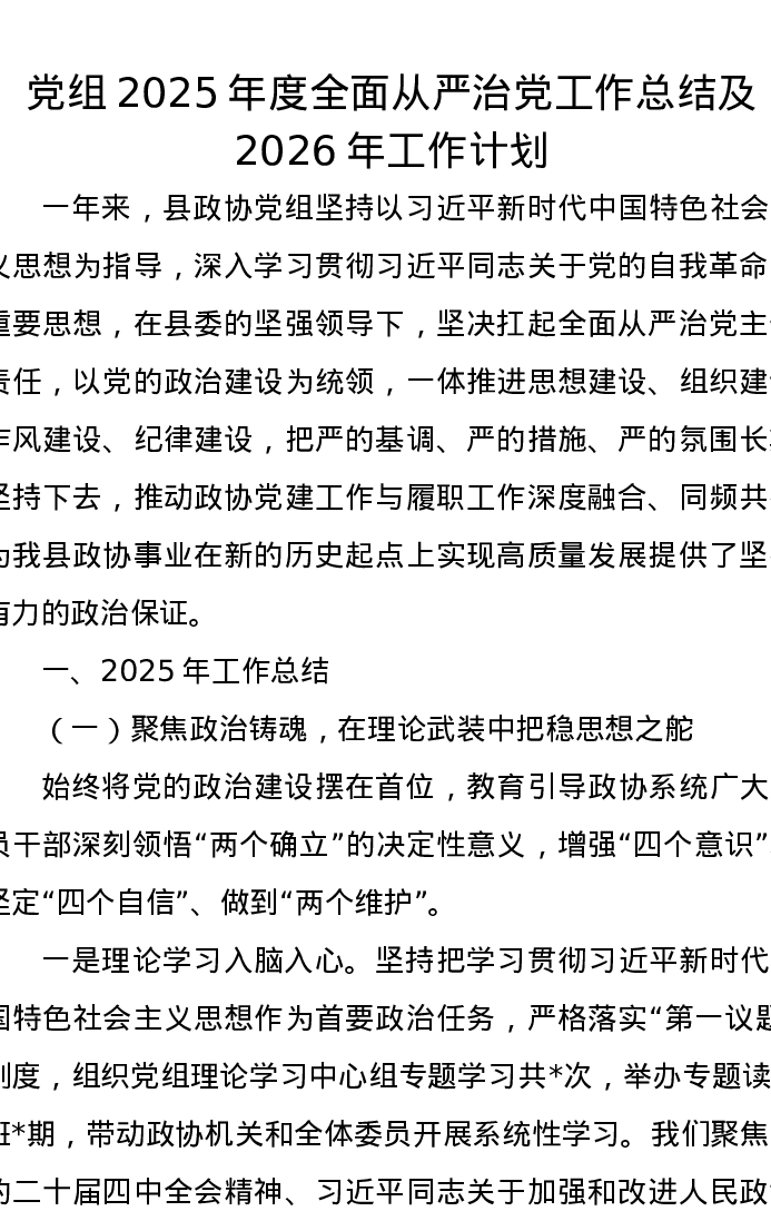 党组2025年度全面从严治党工作总结及2026年工作计划