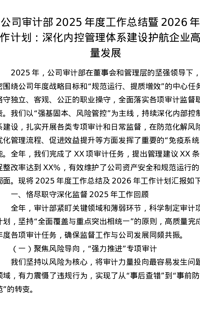 公司审计部2025年度工作总结暨2026年工作计划:深化内控管理体系建设 护航企业高质量发展