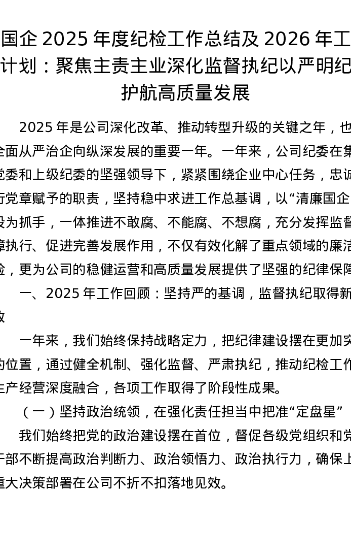 国企2025年度纪检工作总结及2026年工作计划:聚焦主责主业深化监督执纪 以严明纪律护航高质量发展