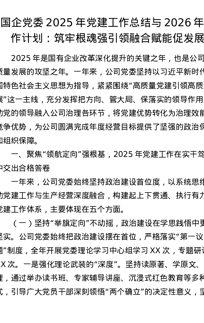 国企党委2025年党建工作总结与2026年工作计划:筑牢根魂强引领 融合赋能促发展