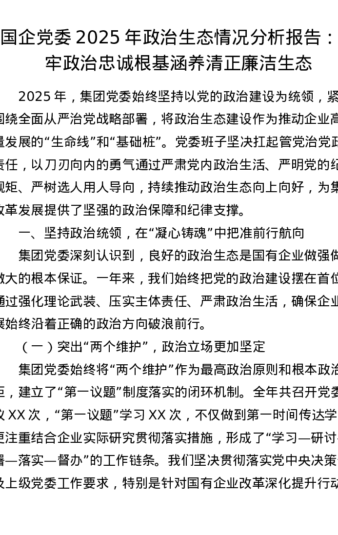 国企党委2025年政治生态情况分析报告:筑牢政治忠诚根基 涵养清正廉洁生态