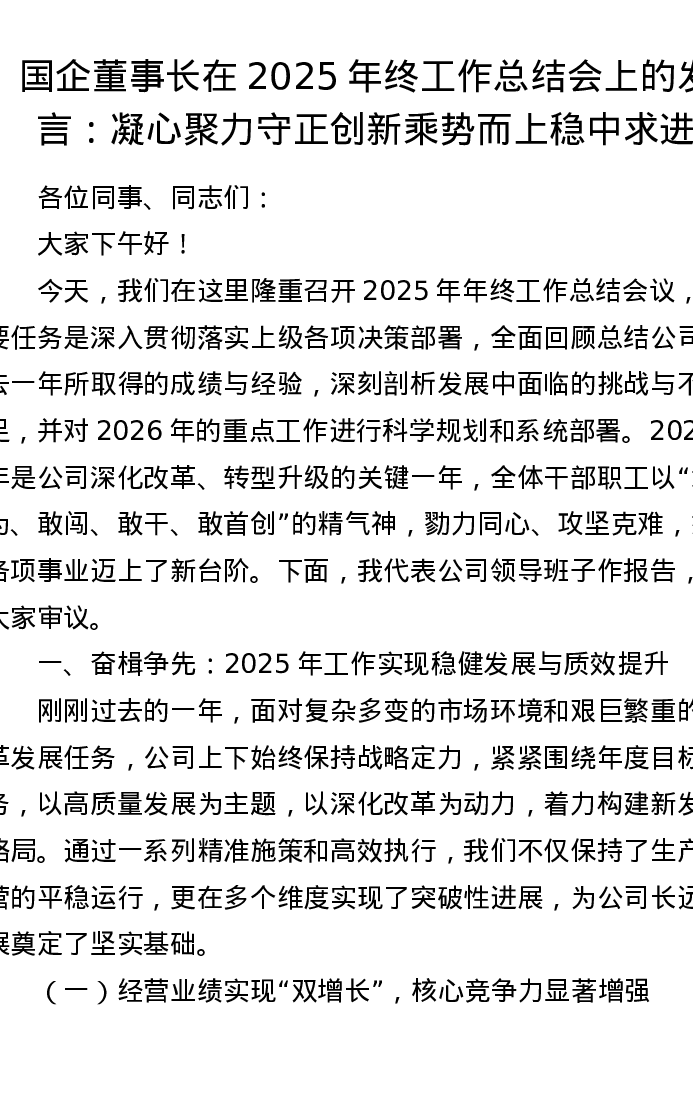国企董事长在2025年终工作总结会上的发言:凝心聚力守正创新 乘势而上稳中求进
