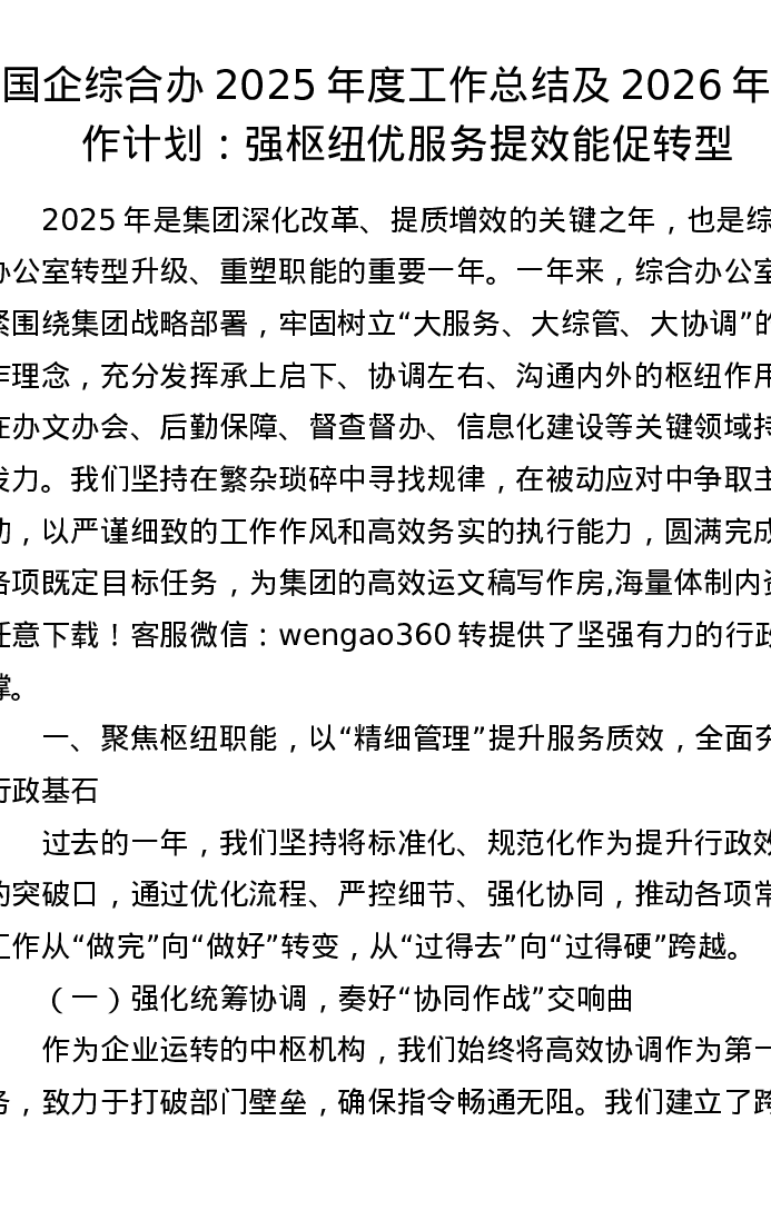 国企综合办2025年度工作总结及2026年工作计划:强枢纽优服务 提效能促转型