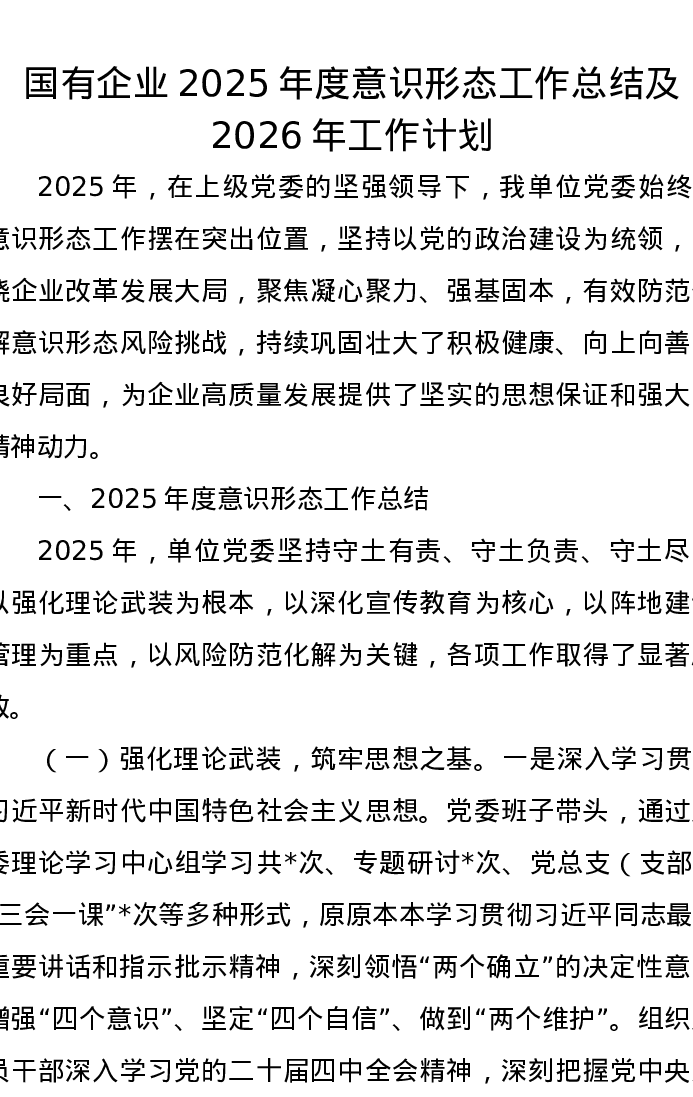国有企业2025年度意识形态工作总结及2026年工作计划