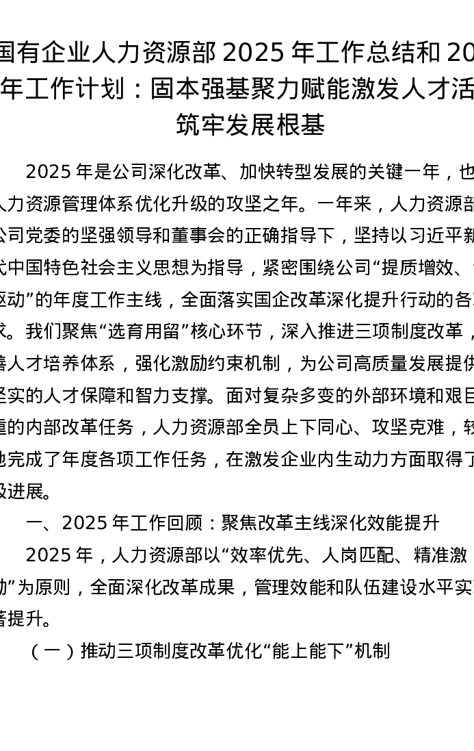 国有企业人力资源部2025年工作总结和2026年工作计划:固本强基聚力赋能 激发人才活力筑牢发展根基
