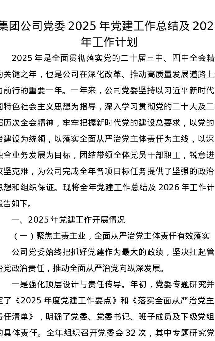 集团公司党委2025年党建工作总结及2026年工作计划