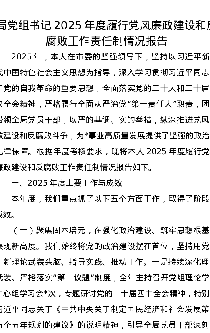 局党组书记2025年度履行党风廉政建设和反腐败工作责任制情况报告