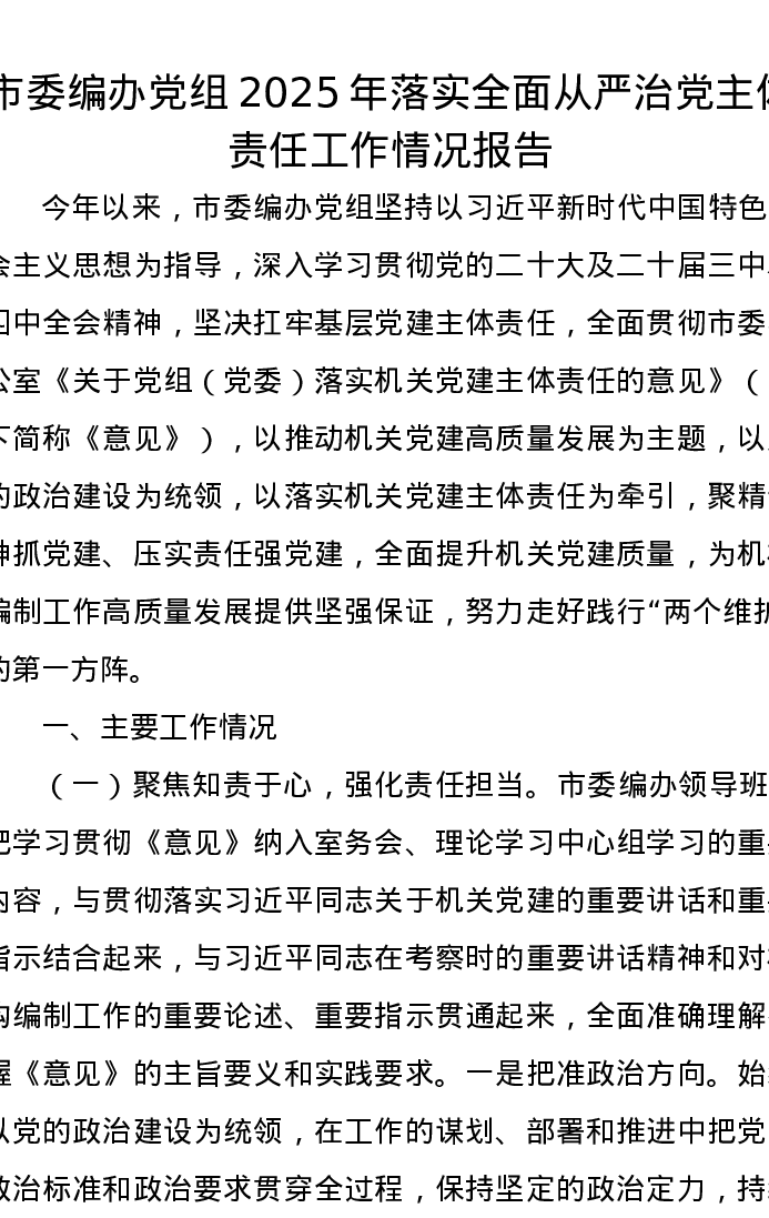 市委编办党组2025年落实全面从严治党主体责任工作情况报告