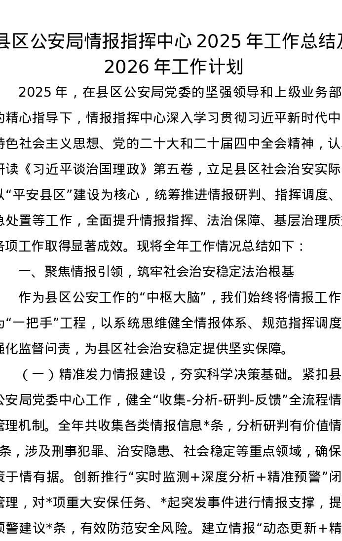县区公安局情报指挥中心2025年工作总结及2026年工作计划