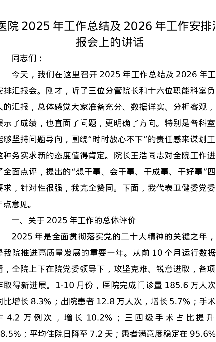 医院2025年工作总结及2026年工作安排汇报会上的讲话