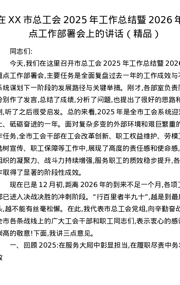 在XX市总工会2025年工作总结暨2026年重点工作部署会上的讲话