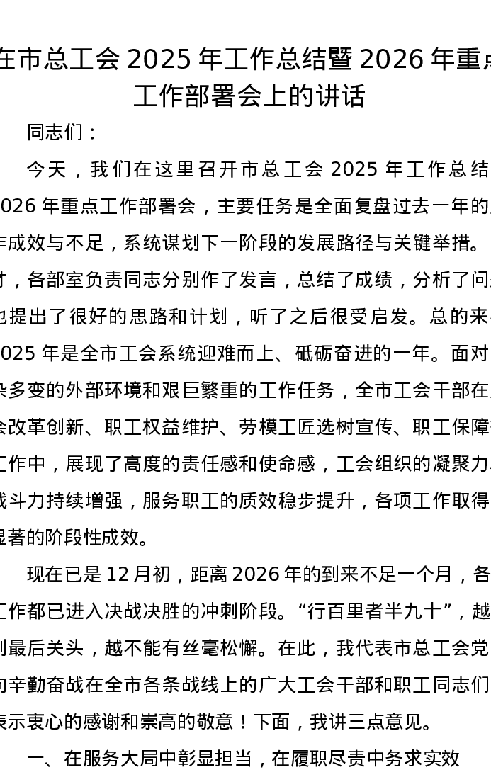 在市总工会2025年工作总结暨2026年重点工作部署会上的讲话