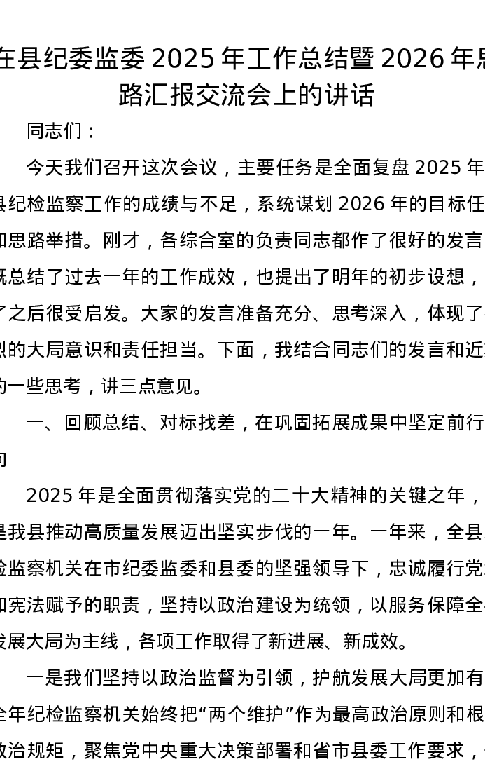 在县纪委监委2025年工作总结暨2026年思路汇报交流会上的讲话