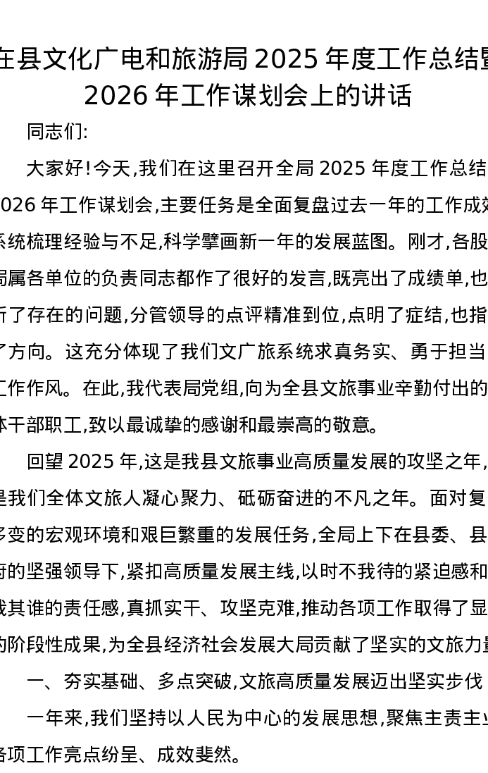 在县文化广电和旅游局2025年度工作总结暨2026年工作谋划会上的讲话