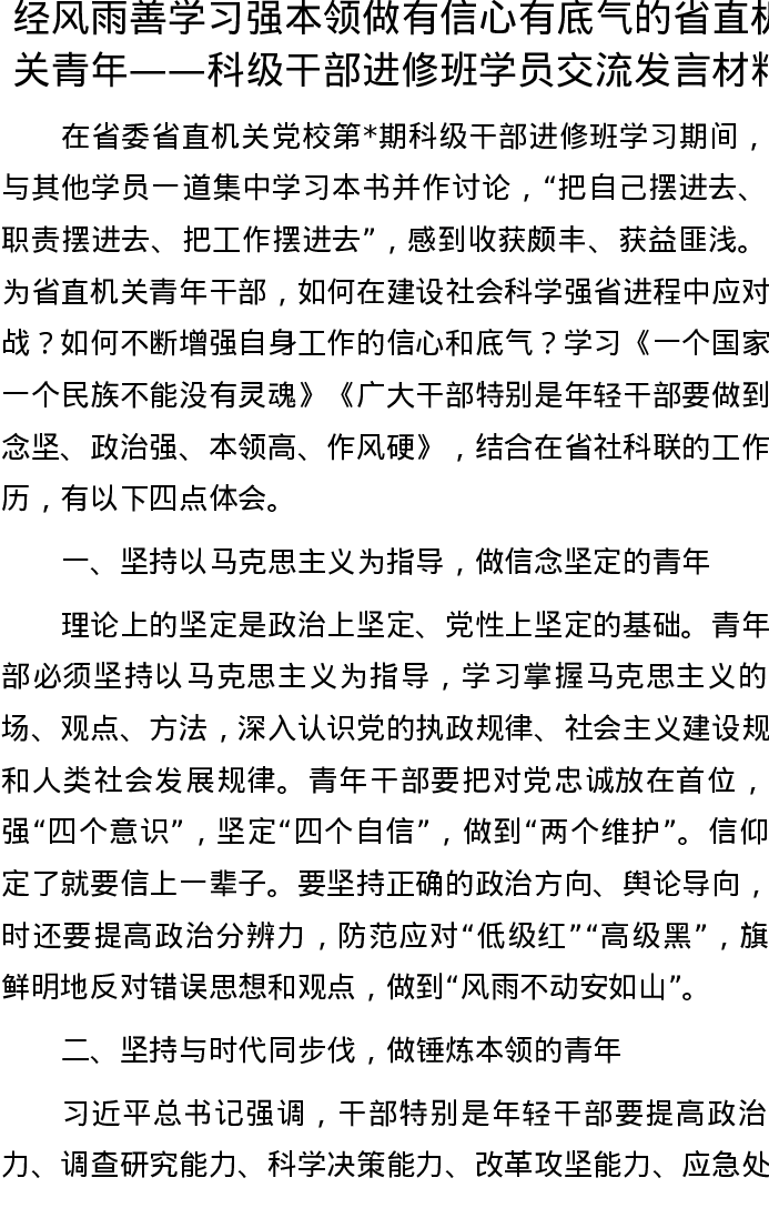 20220904经风雨 善学习 强本领 做有信心有底气的省直机关青年——科级干部进修班学员交流发言材料