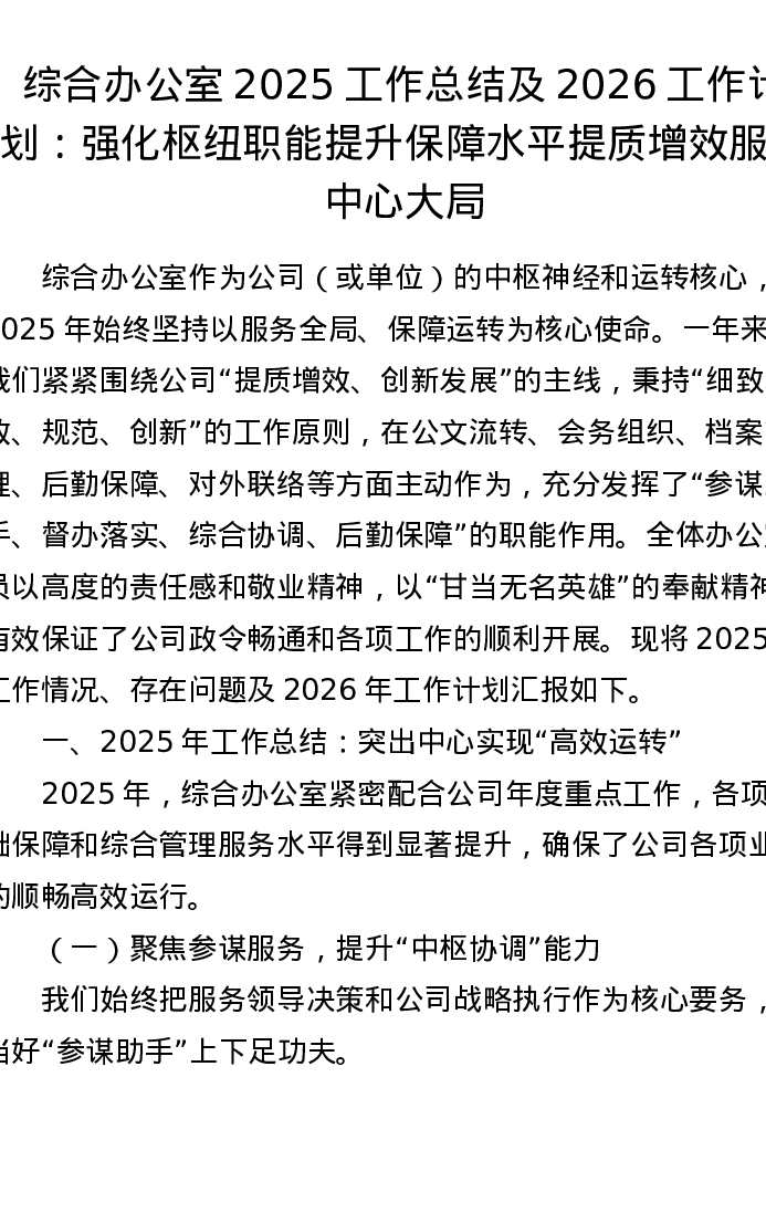 综合办公室2025工作总结及2026工作计划:强化枢纽职能提升保障水平 提质增效服务中心大局