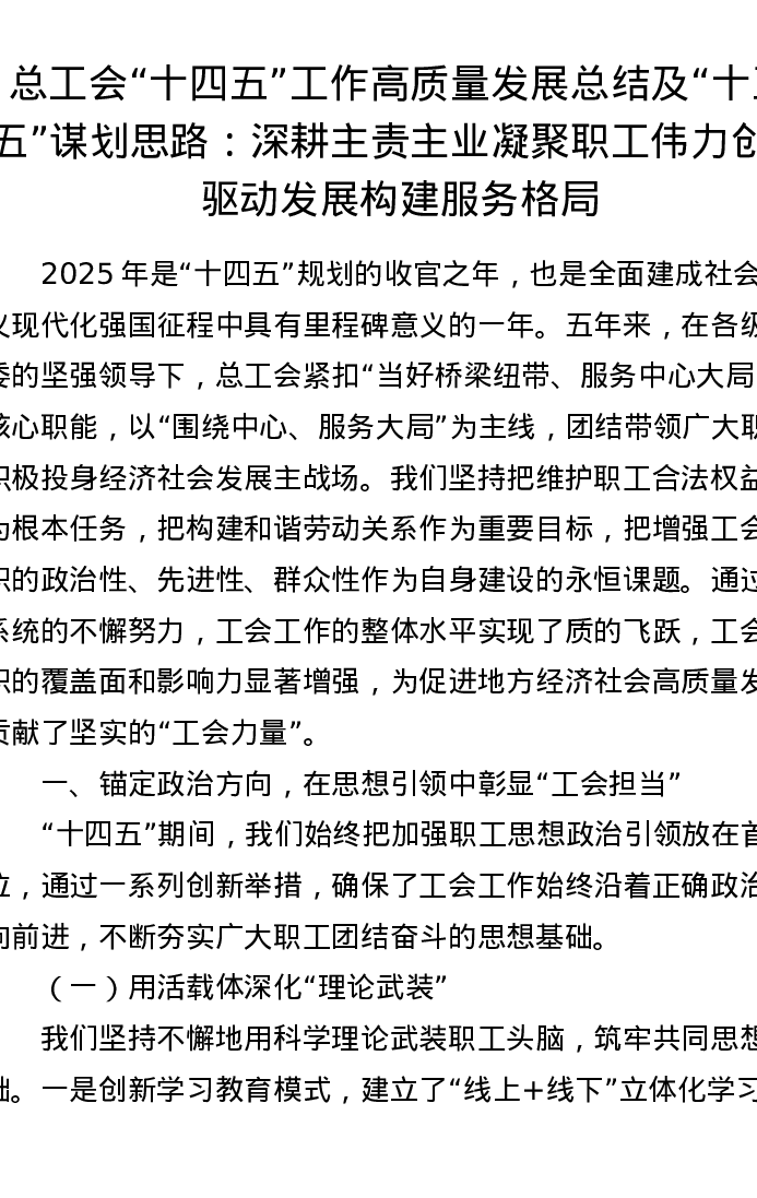 总工会“十四五”工作高质量发展总结及“十五五”谋划思路:深耕主责主业凝聚职工伟力 创新驱动发展构建服务格局