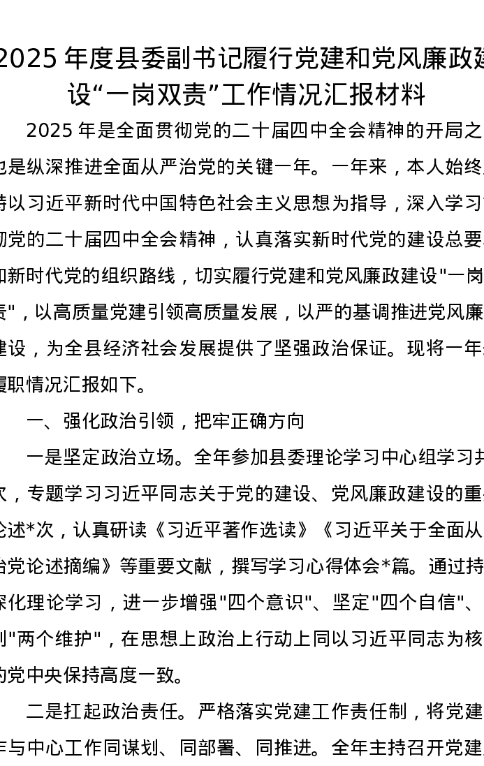 2025年度县委副书记履行党建和党风廉政建设“一岗双责”工作情况汇报材料