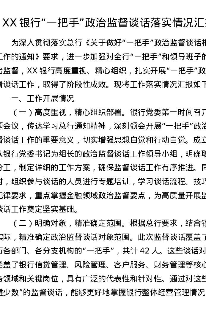 XX银行“一把手”政治监督谈话落实情况汇报