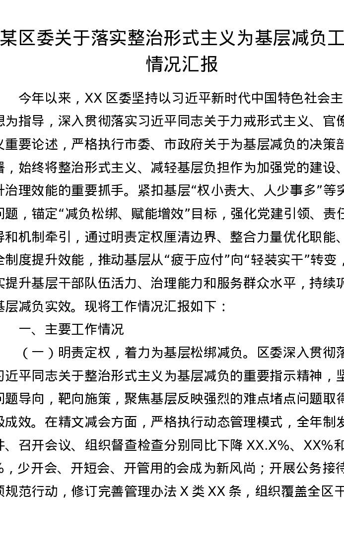 某区委关于落实整治形式主义为基层减负工作情况汇报