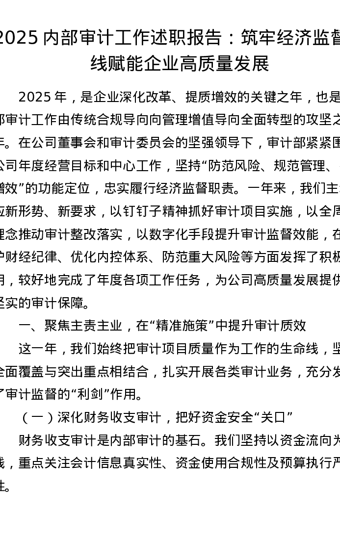 2025内部审计工作述职报告:筑牢经济监督防线 赋能企业高质量发展