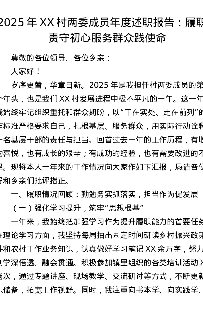 2025年XX村两委成员年度述职报告:履职尽责守初心 服务群众践使命