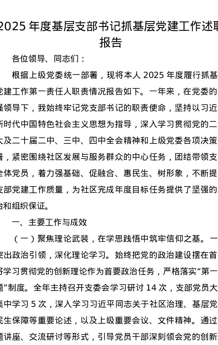 2025年度基层支部书记抓基层党建工作述职报告